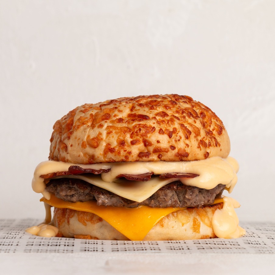 Queso cheddar, queso emmental, bacon x3, y salsa de quesos