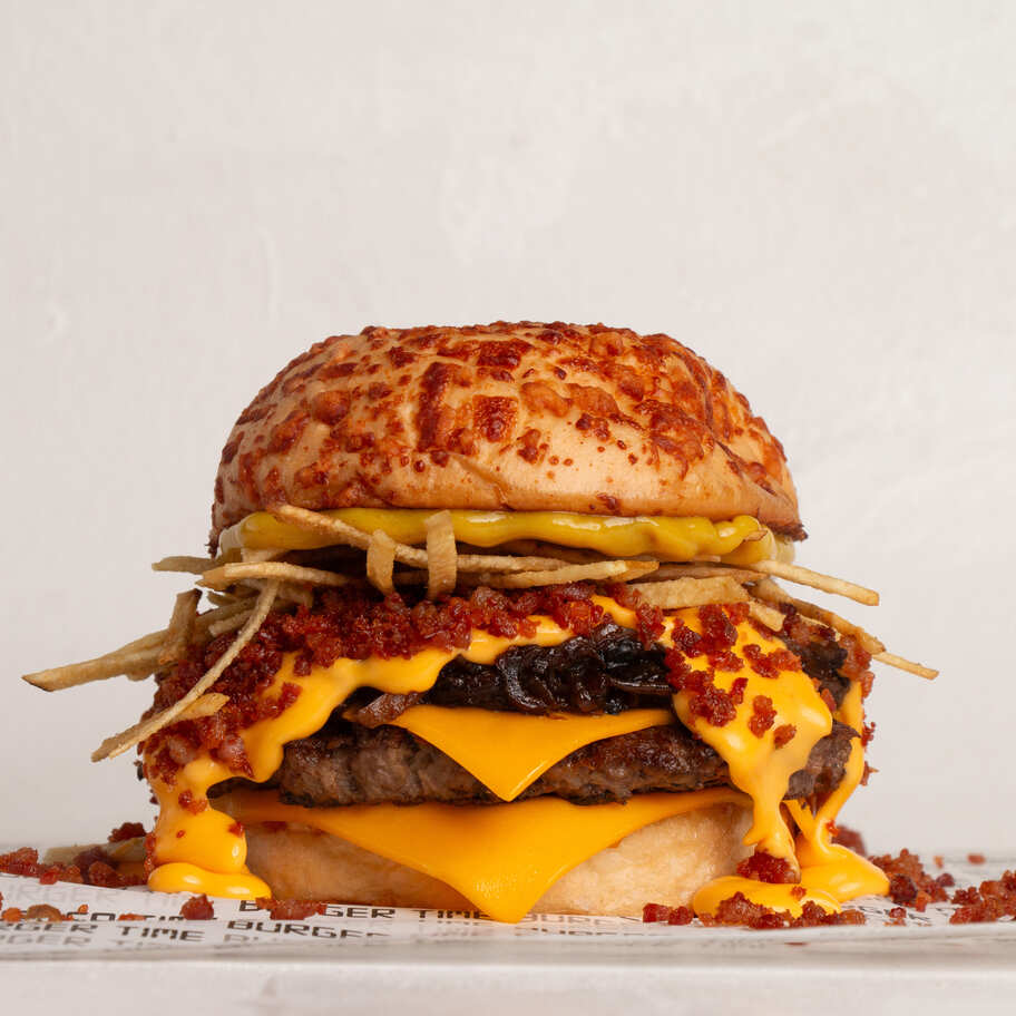 Queso cheddar, salsa cheddar, bacon, papas pay, cebolla caramelizada y mostaza.
