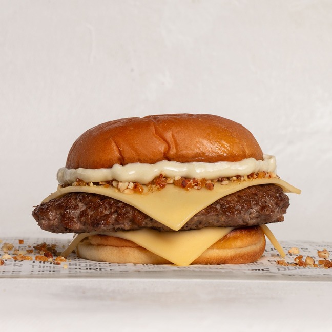 Pan Martin’s, queso emmental, salsa de queso azul y crocante de almendras glaseadas