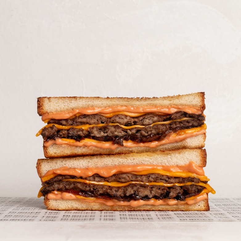 Pan de molde tostado a la plancha con manteca, 2 carnes smash, queso cheddar, cebolla caramelizada y salsa BT.