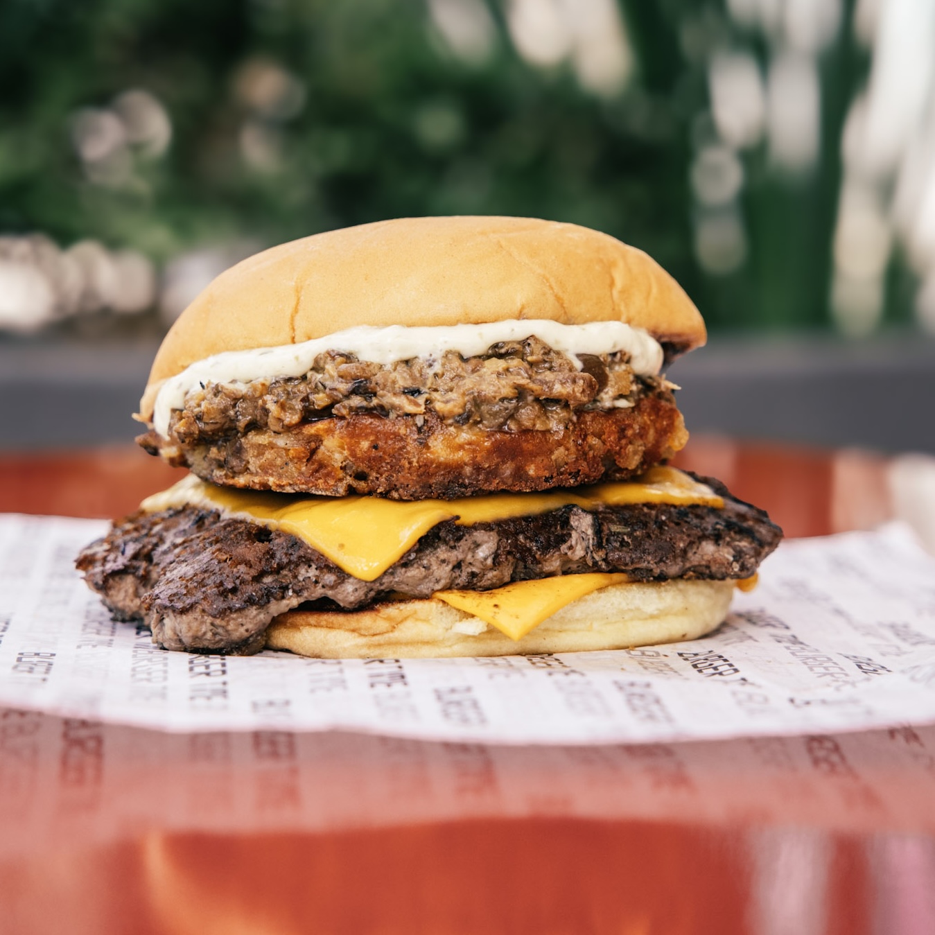 Pan Martins, queso cheddar, papa rosti, crema de hongo, salsa tártara